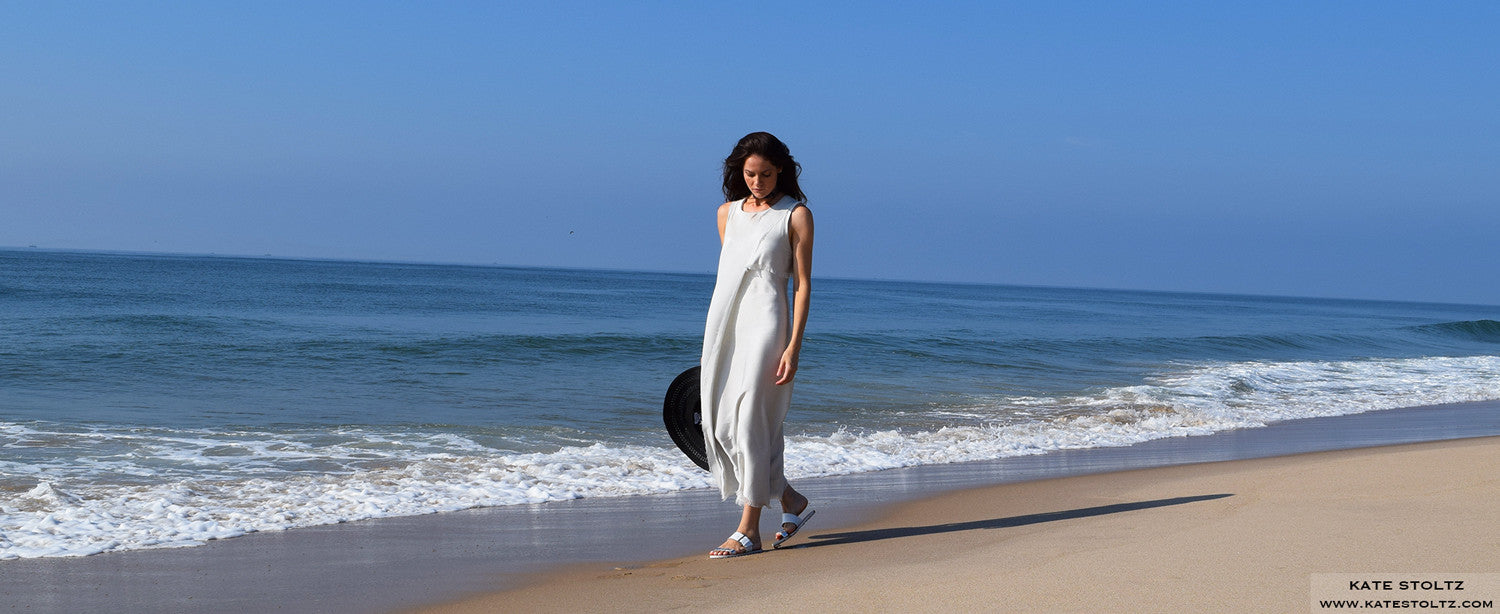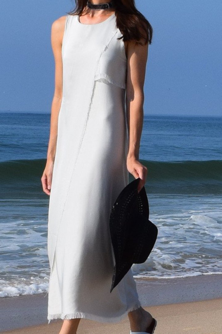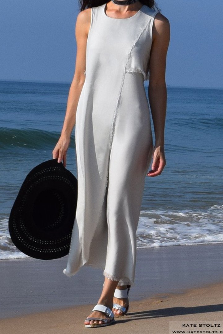 Bespoke asymmetrical Kate Stoltz NYC silk dress with fringed edges.