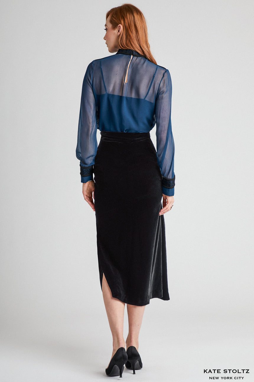 Aegean Sea Silk Chiffon Blouse with Black Braid Trim and Delicate Lace Detail