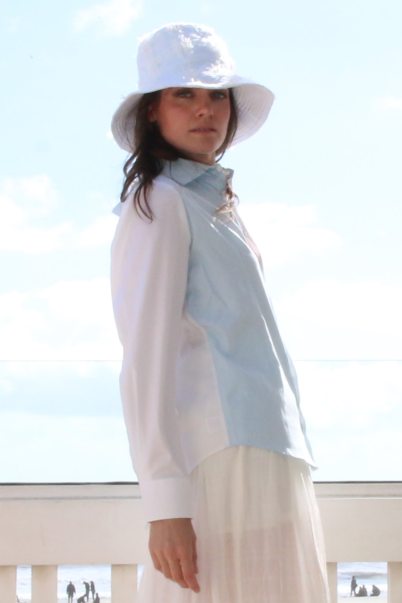 Blue and White button down shirt created out of up-cycled Egyptian cotton shirts.