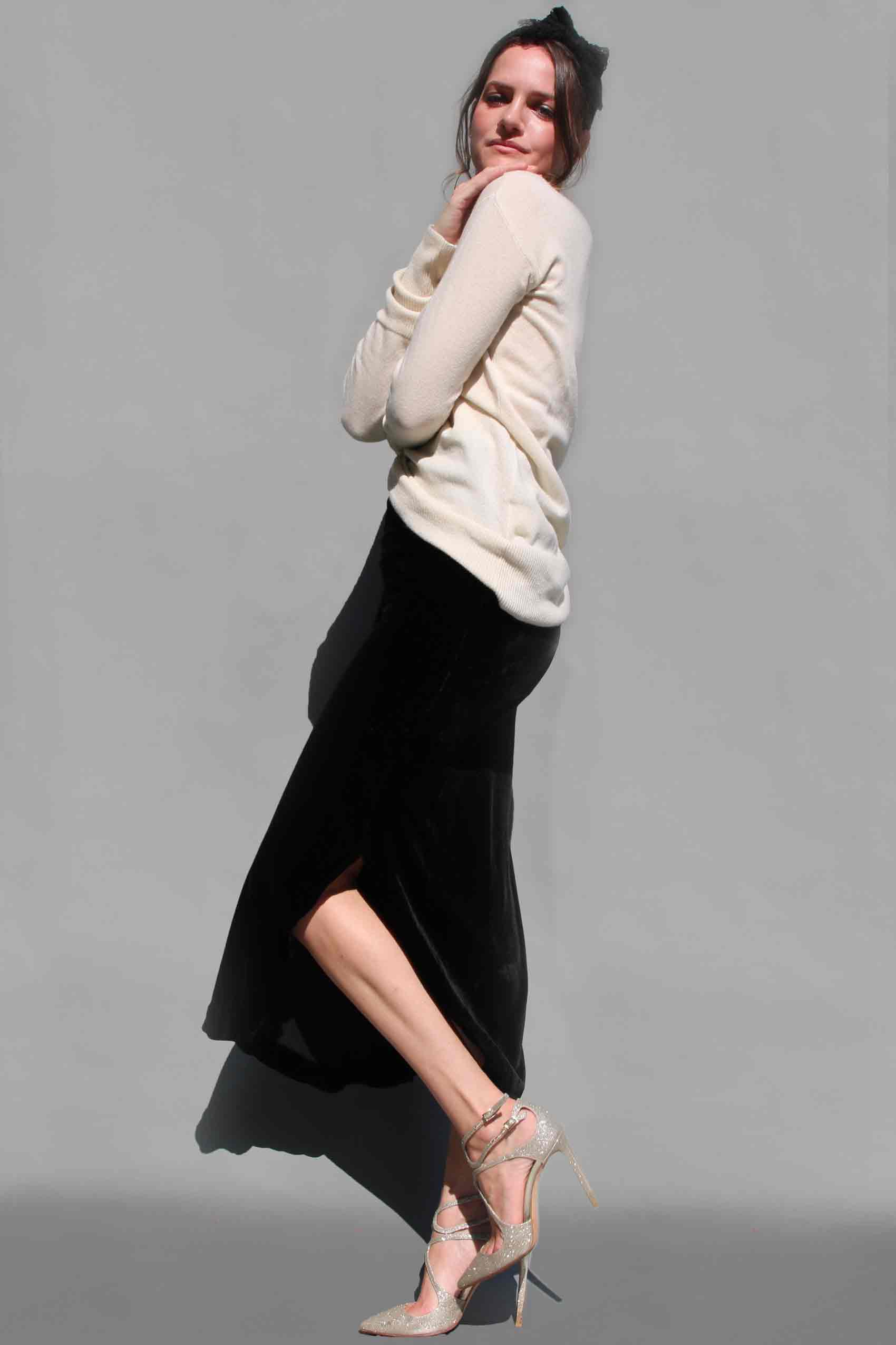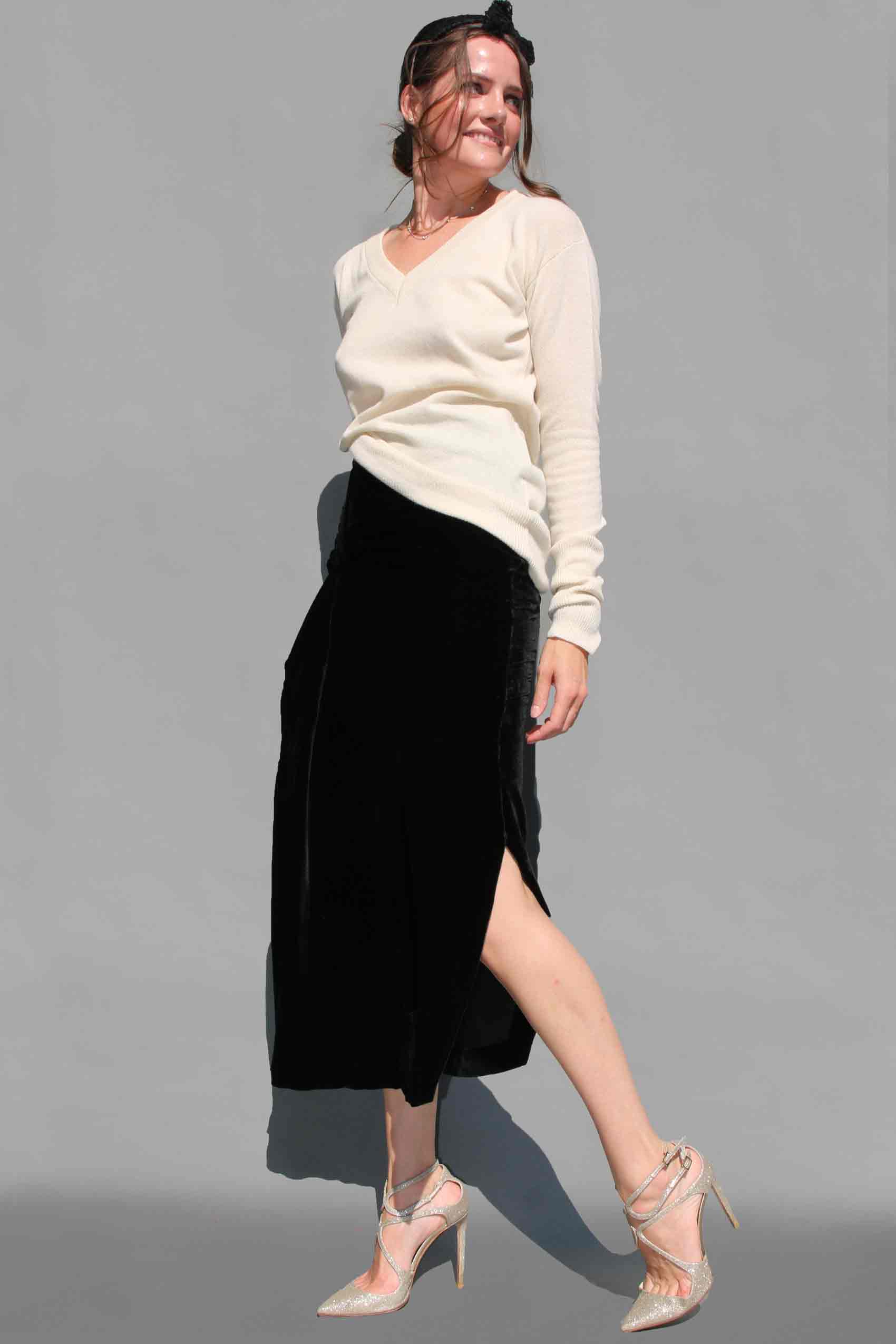 Kate Stoltz draped black velvet midi skirt with front side pleating and left side leg slit.