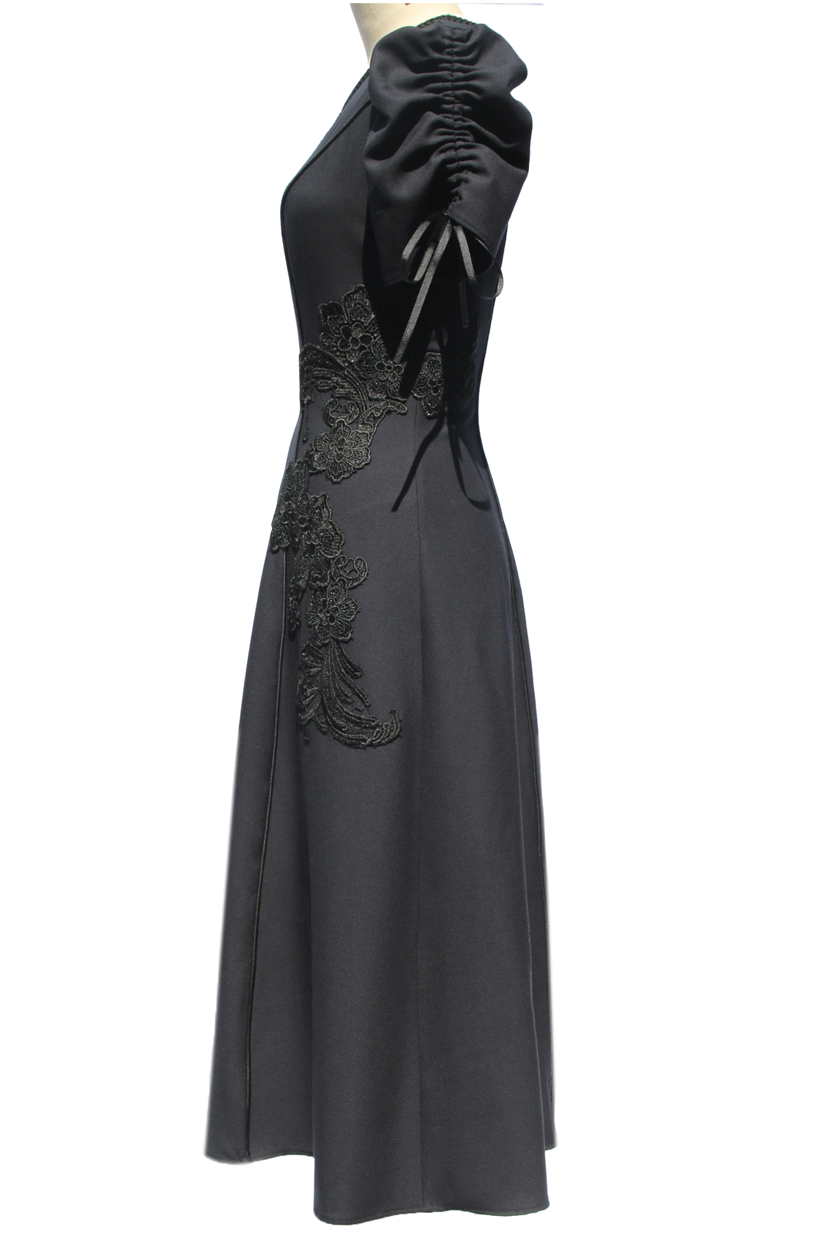 Dark navy wool fit and flare dress with black guipure lace appliqué along body, and ruched puff sleeves. Black braid along neck and silk corded binding along princess seams.