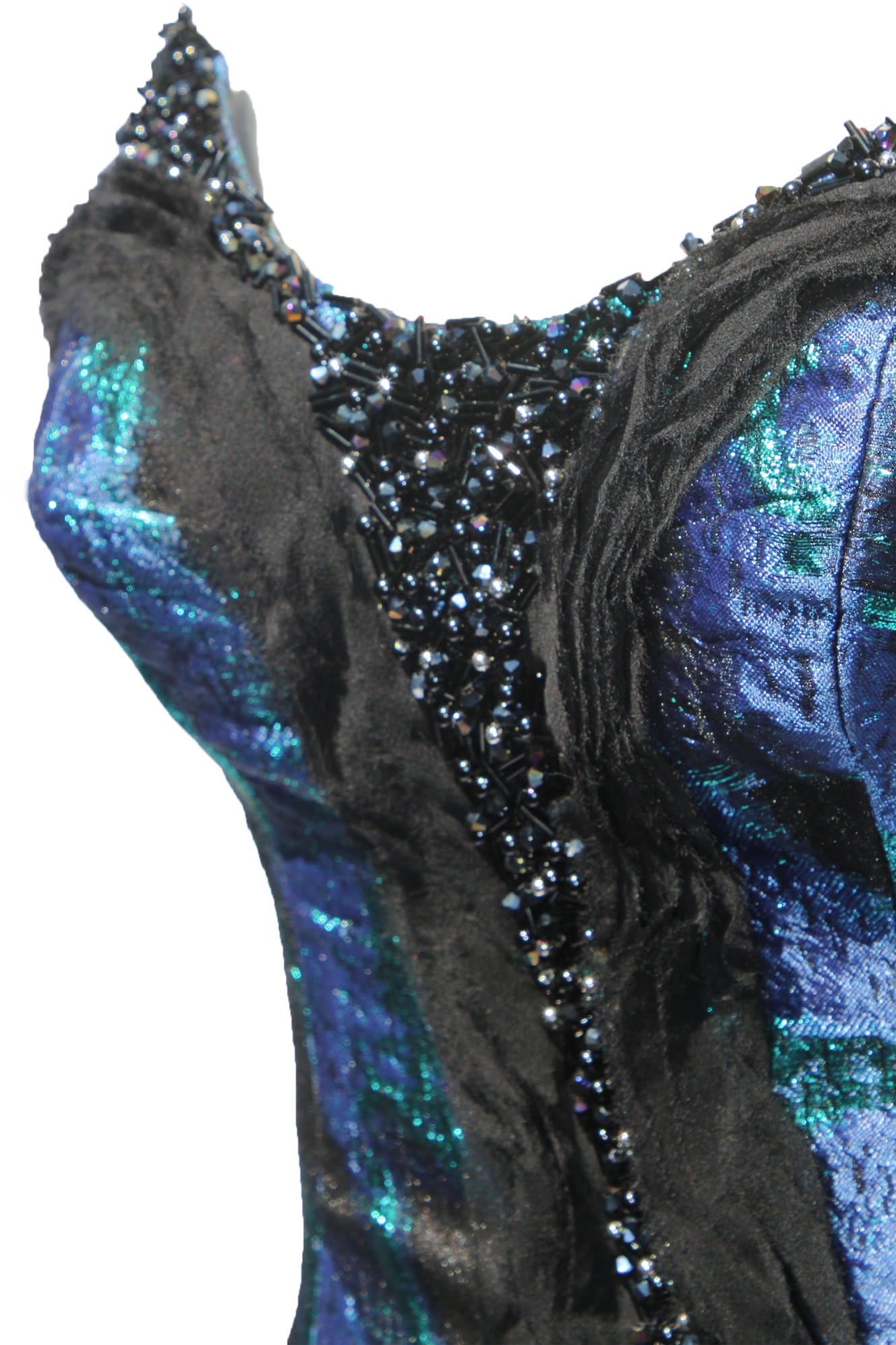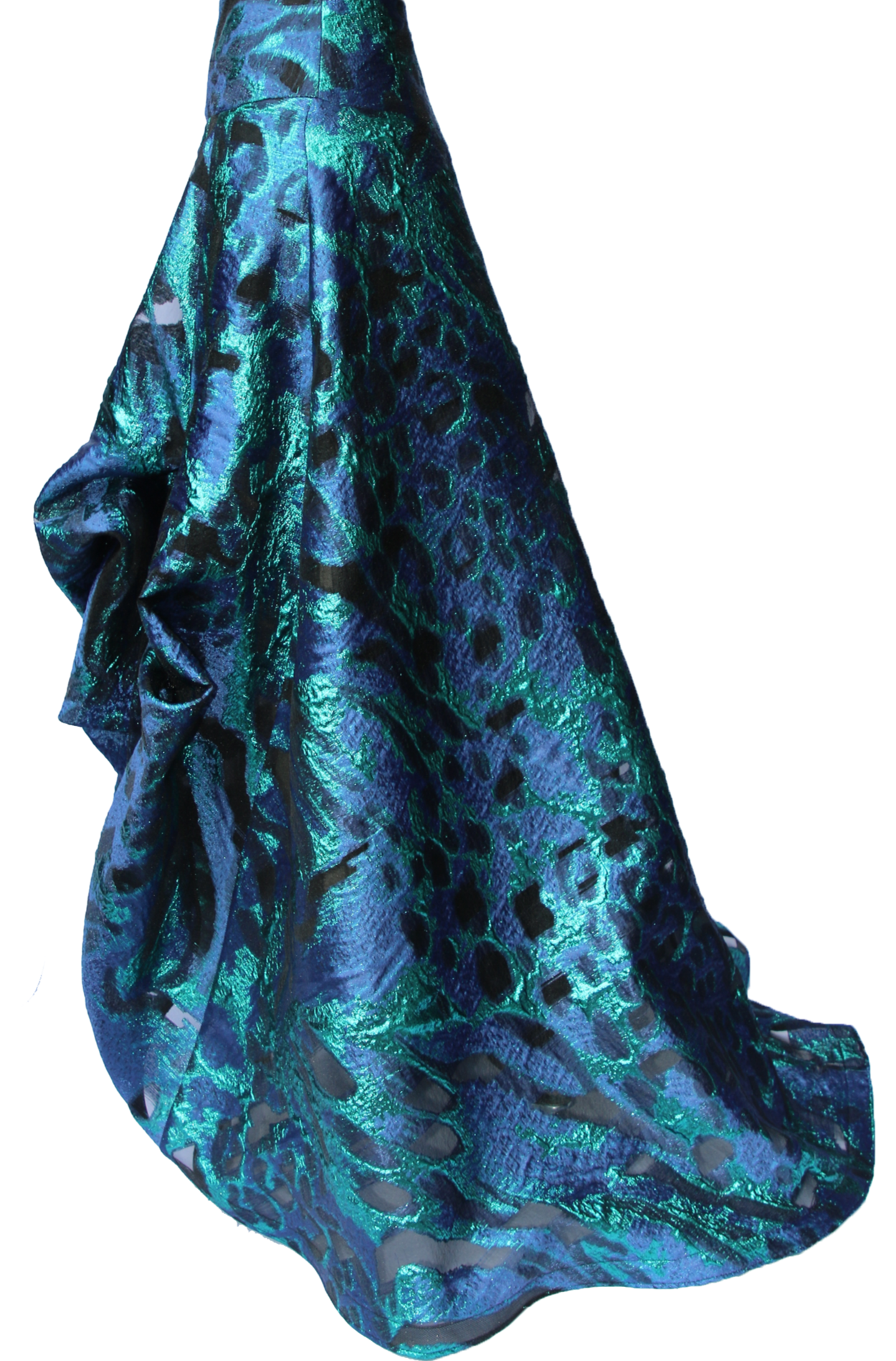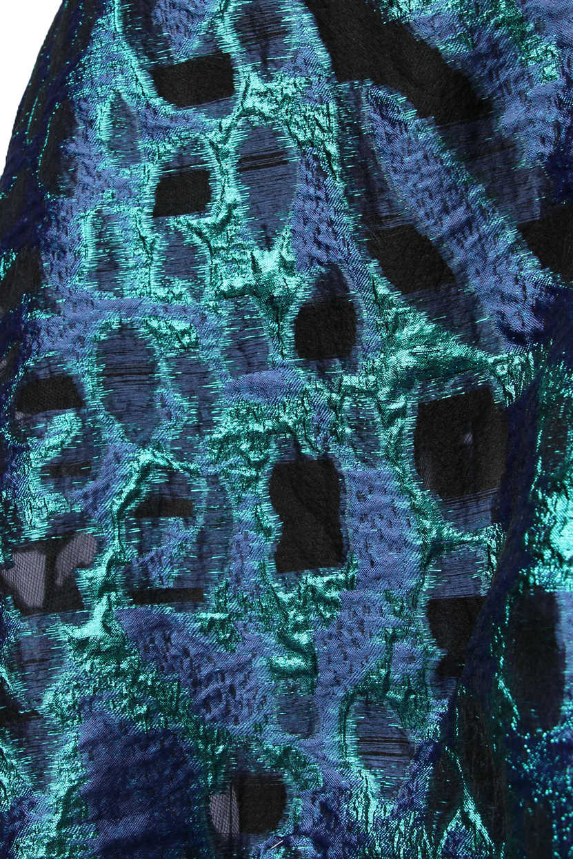 Jewel tone metallic fibers woven through black organza to create a swirling design in a blue-green and deep navy, with pockets of unadorned organza left for even more textural delight. Crisp in hand with a light, voluminous drape.