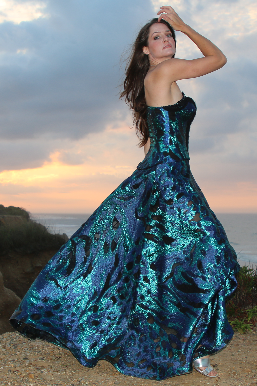 Jewel tone metallic fibers woven through black organza to create a swirling design in a blue-green and deep navy, with pockets of unadorned organza left for even more textural delight. Crisp in hand with a light, voluminous drape.