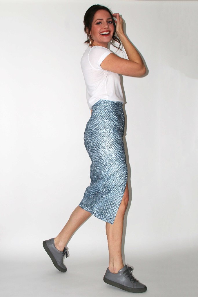 Diamond quilted blue skirt with front slit