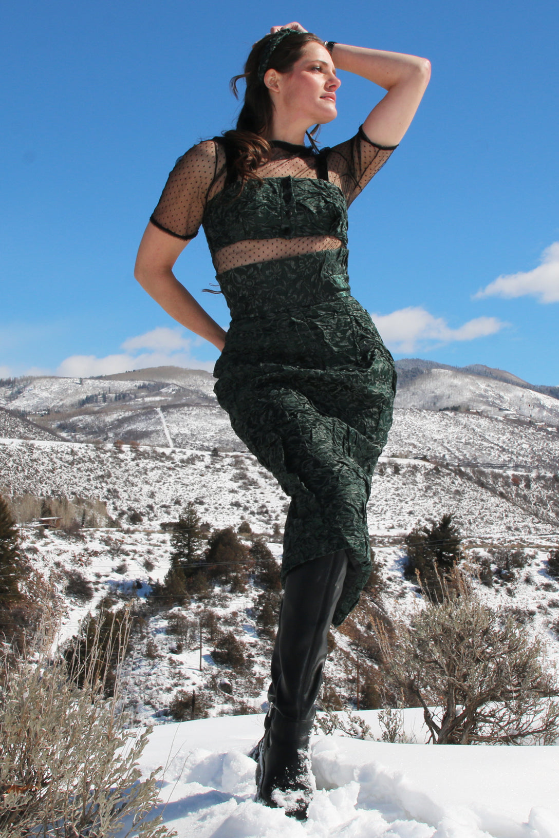 Kate Stoltz pine green ruched brocade with metallic embossed floral detail crop top. Center front closure with silk covered buttons, and 1 inch velvet straps. Fully lined with silk charmeuse.
