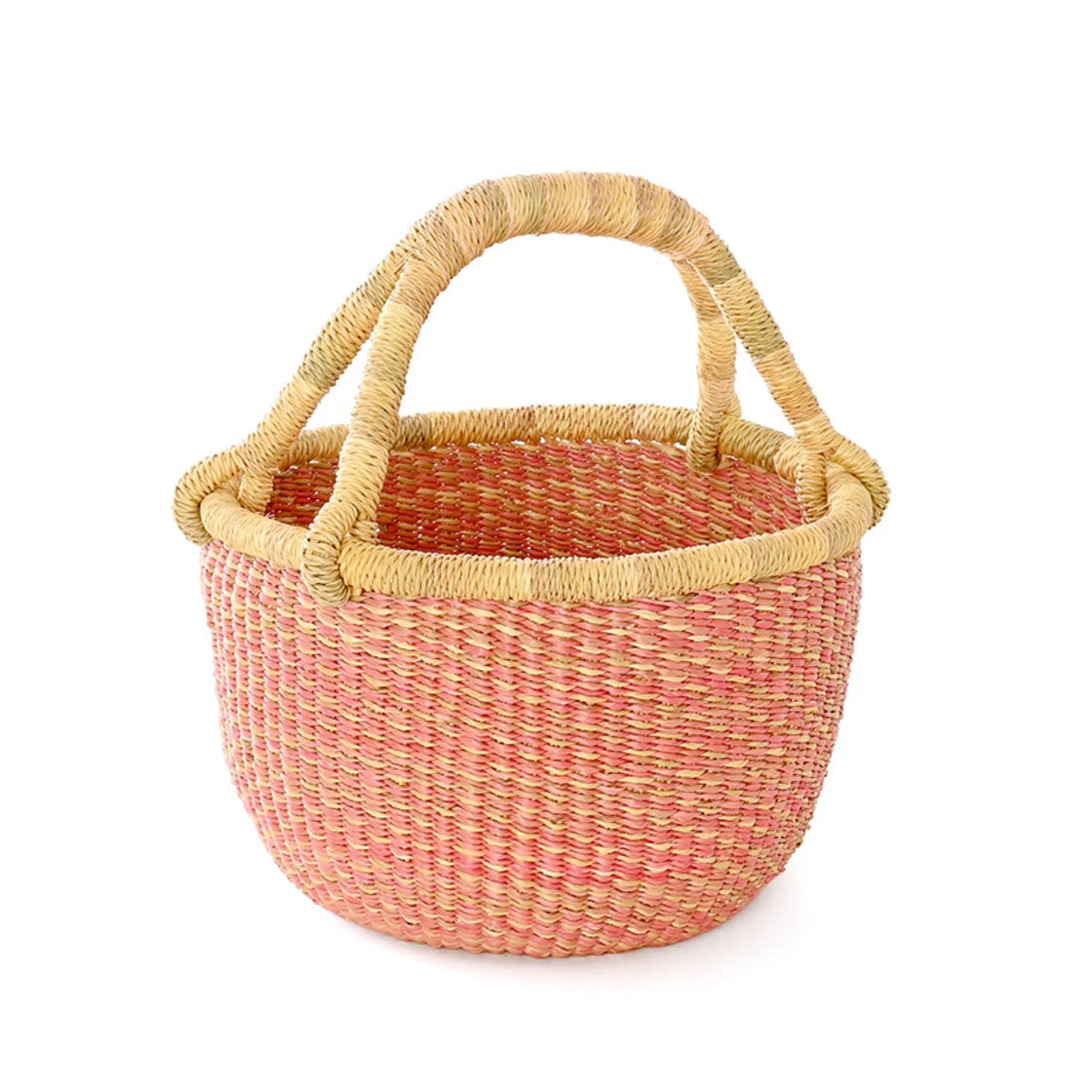 Durable Bolga basket handwoven from thick, tough elephant grass by artisans in the Bolgatanga region of Ghana Weavers create this smaller kettle basket with a pear-shaped bottom and a handle.
