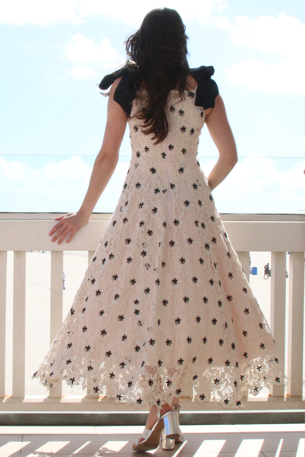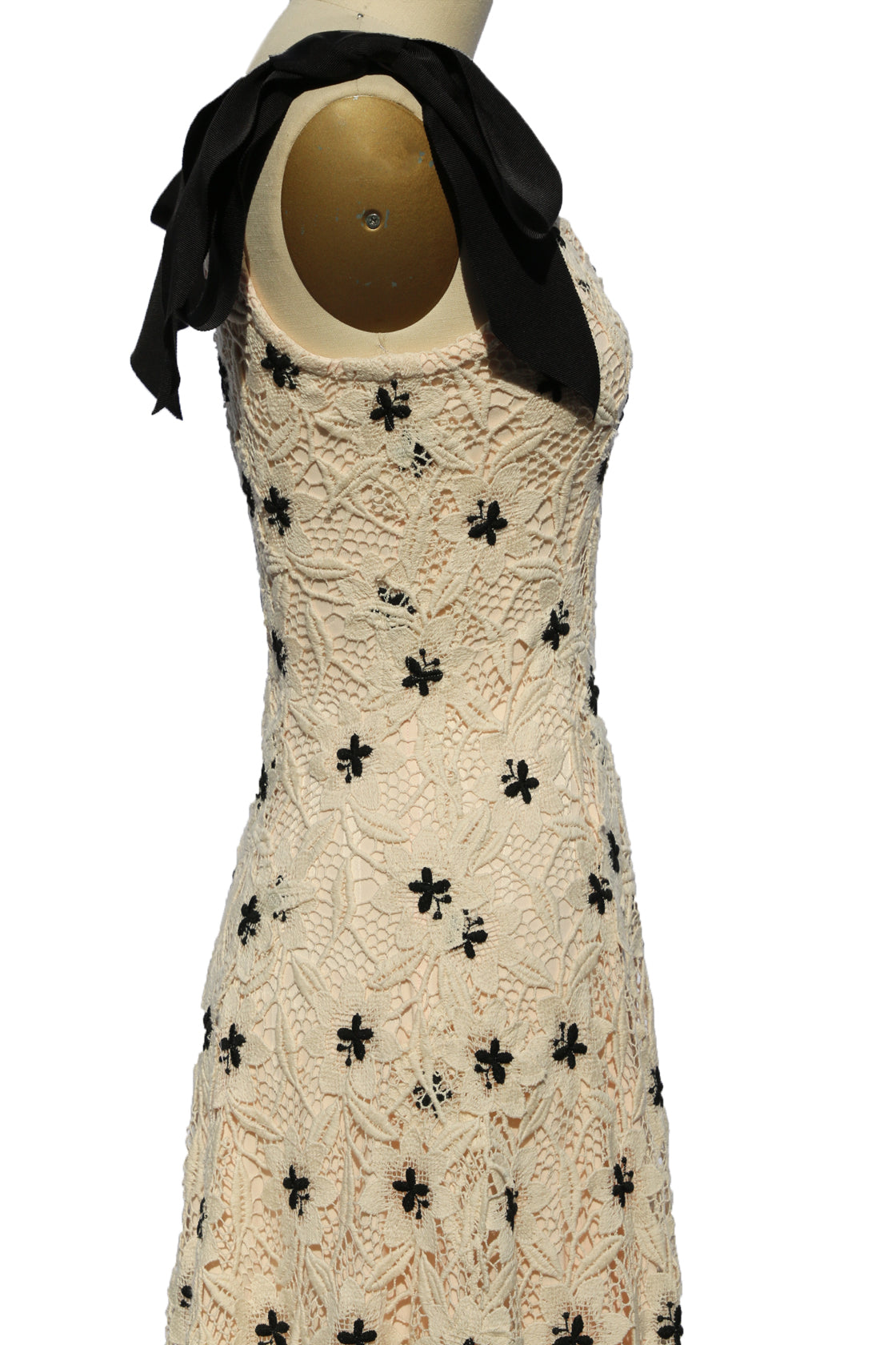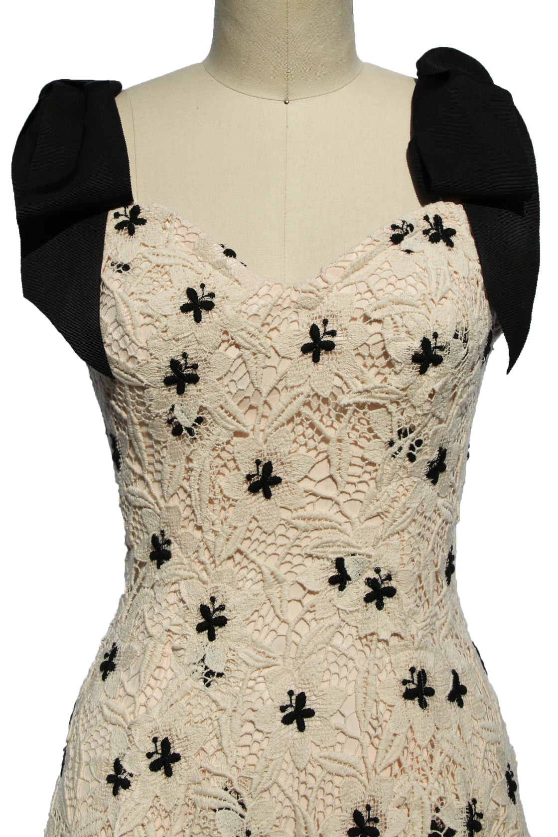 Ivory florals with a black butterfly create a stunning lace, layered over silk charmeuse in a fit and flare dress perfect for garden parties, dinner dates and other special occasions.