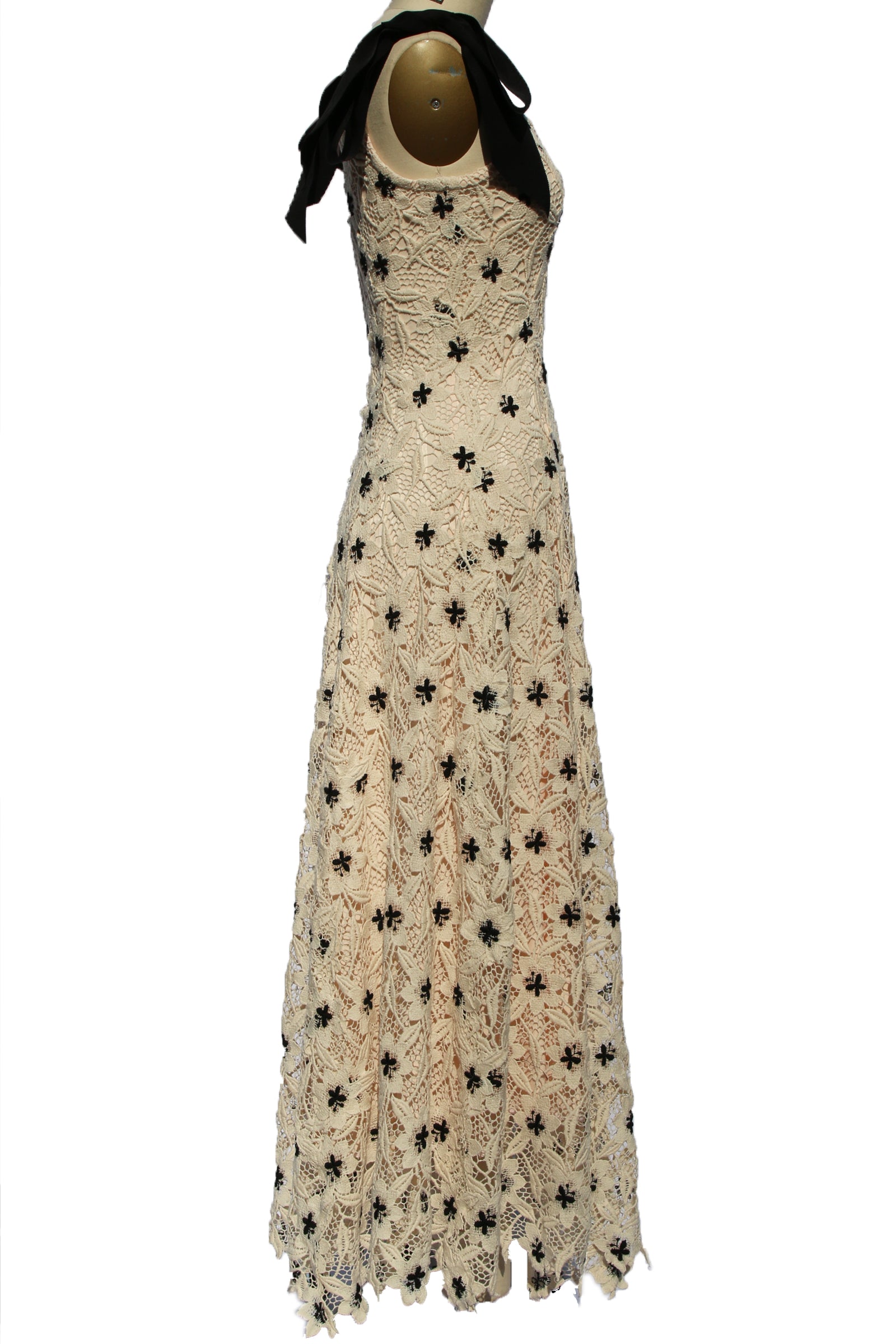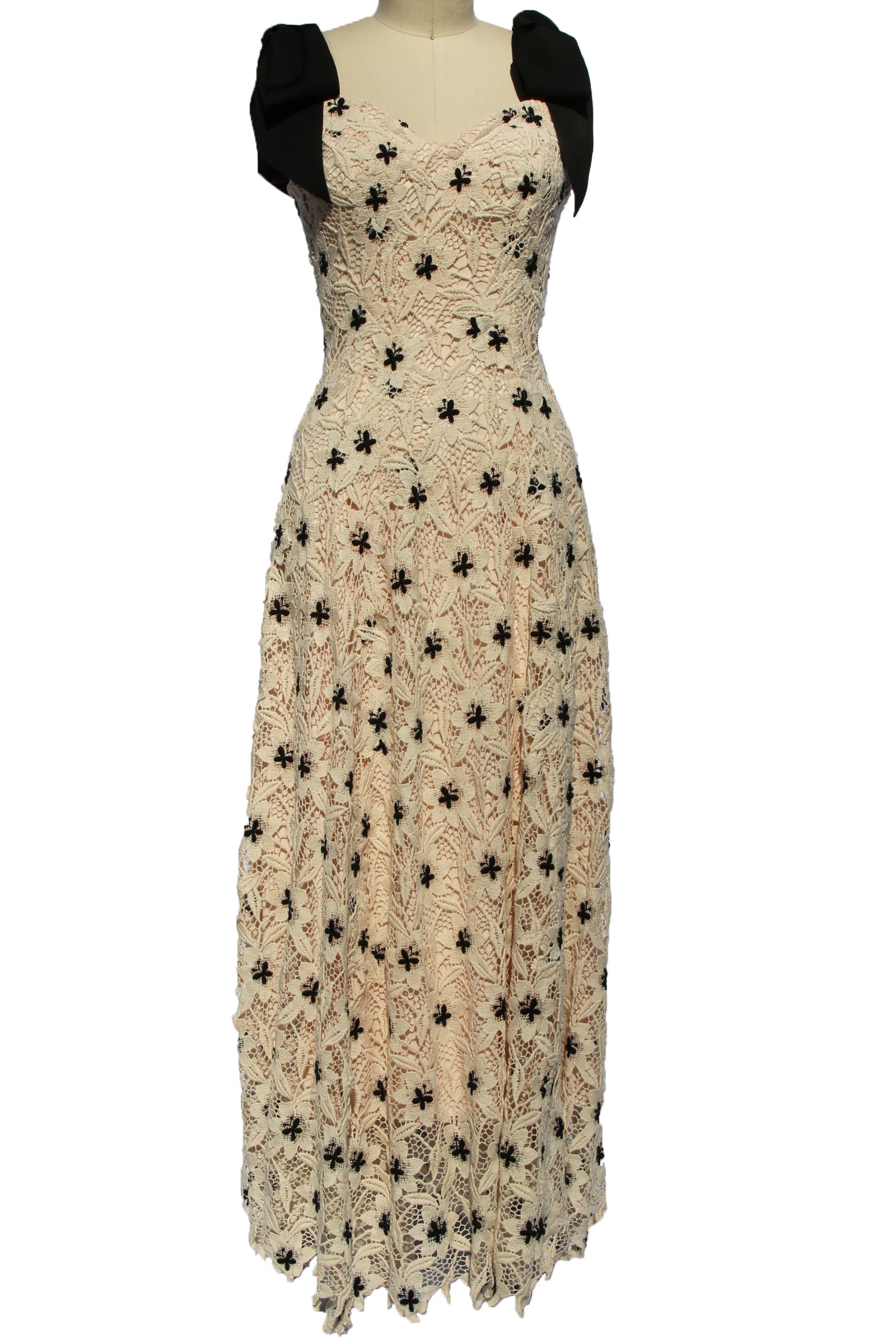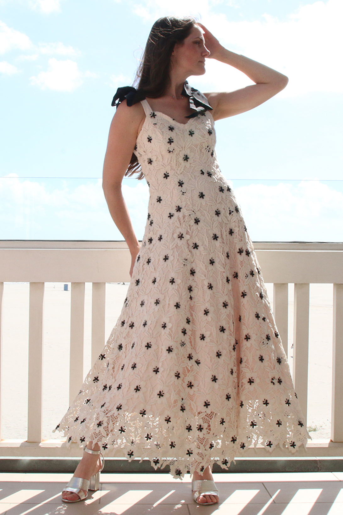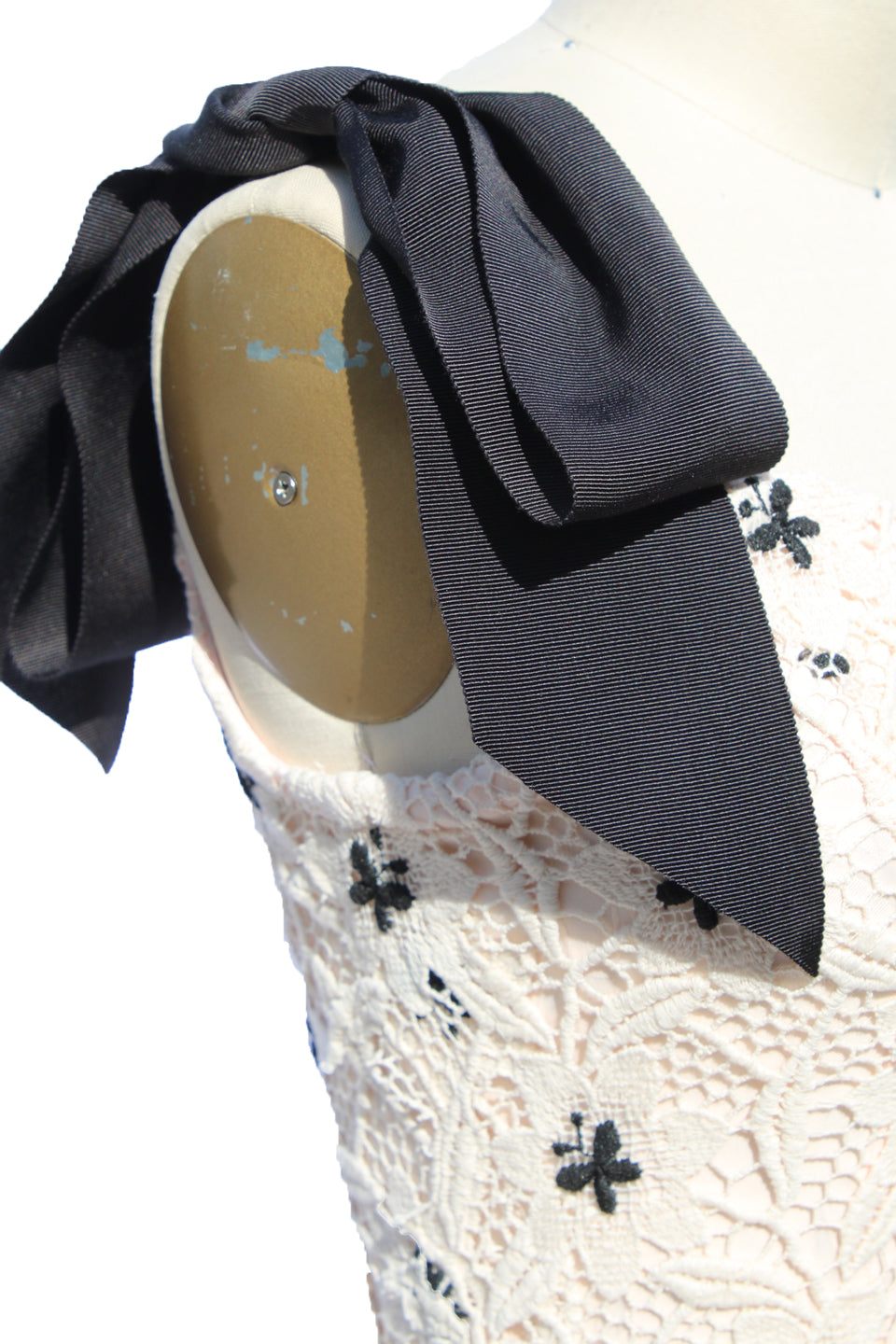 Ivory florals with a black butterfly create a stunning lace, layered over silk charmeuse in a fit and flare dress perfect for garden parties, dinner dates and other special occasions.
